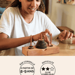 Ce casse-tête pédagogique est un grand classique des jeux de logique et de mathématiques. L’objectif paraît simple : transférer toute la tour sur l’un des 3 piquets du plateau… mais attention, il est interdit de poser un disque sur un autre plus petit et vous ne pouvez déplacer qu’une seule pièce à la fois !