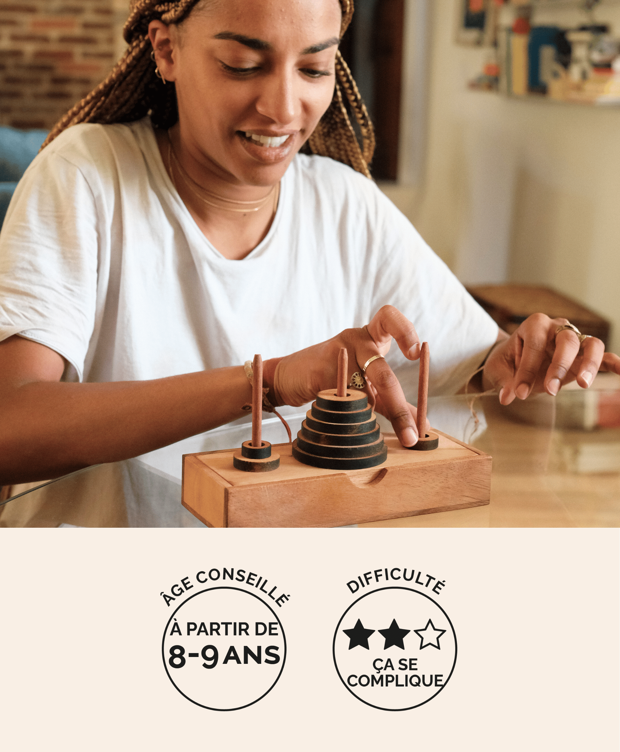 Jeu de logique La Tour de Hanoï en bois avec un joueur déplaçant un disque – Jeux Faugère