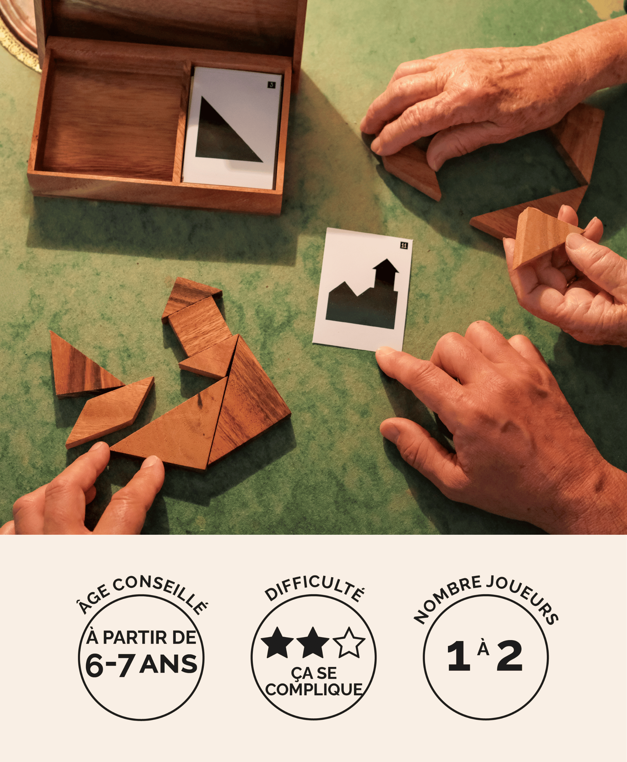 Le coffret comprend 2 tangrams (2 × 7 pièces) et une cinquantaine de cartes défis à reproduire.