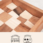 Un élégant coffret en bois qui cache un vrai casse-tête ! Les pièces en forme de damier doivent être parfaitement imbriquées les unes sur les autres pour retrouver leur place dans la boîte. Plus difficile qu’il n’y paraît, ce puzzle stimule logique, patience et sens de l’observation.