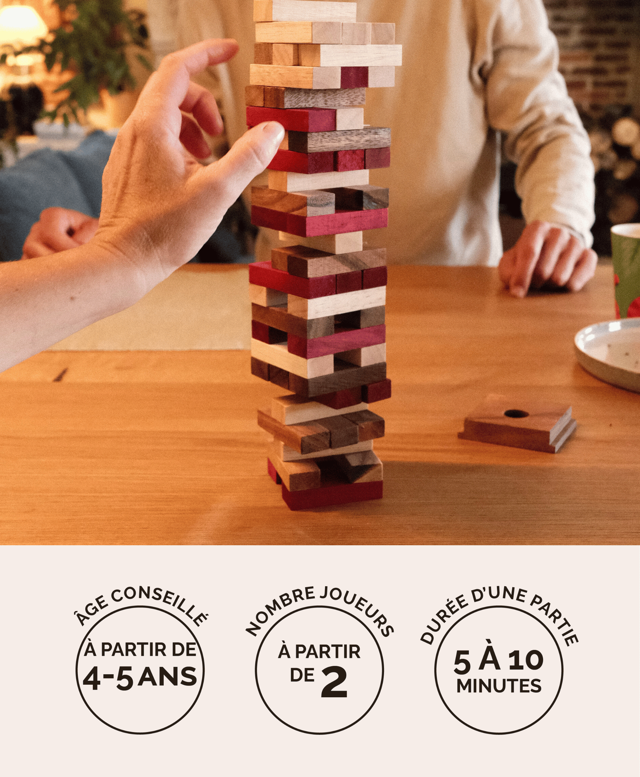Cette version revisitée apporte une touche encore plus ludique grâce à ses 3 couleurs (rouge, bois clair et bois foncé) et à son dé spécial.