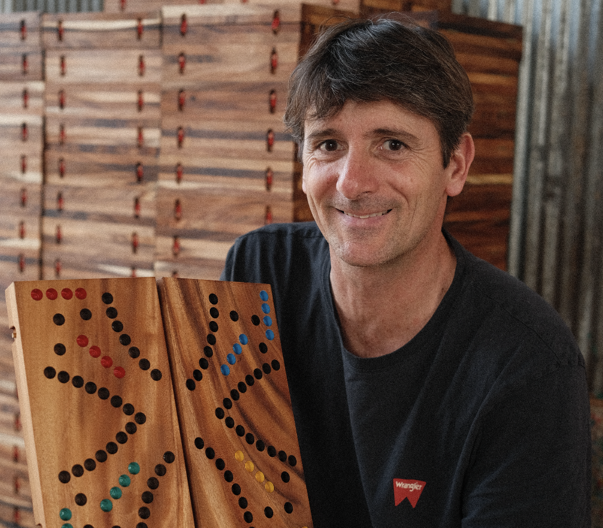 « C’est avec mon père que j’ai commencé à jouer. On se lançait dans des duels de Yams, de crapette ou de 8 américain... J’ai aussi été joueur professionnel de jeu de paume : les valeurs du jeu font partie de mon ADN. Aujourd’hui, papa de quatre enfants, j’aime partager avec eux des moments autour de jeux de stratégie, d’adresse ou de mémoire. Rassembler les gens avec des jeux en bois venus des quatre coins du monde, c’est ce qui me fait vibrer. »