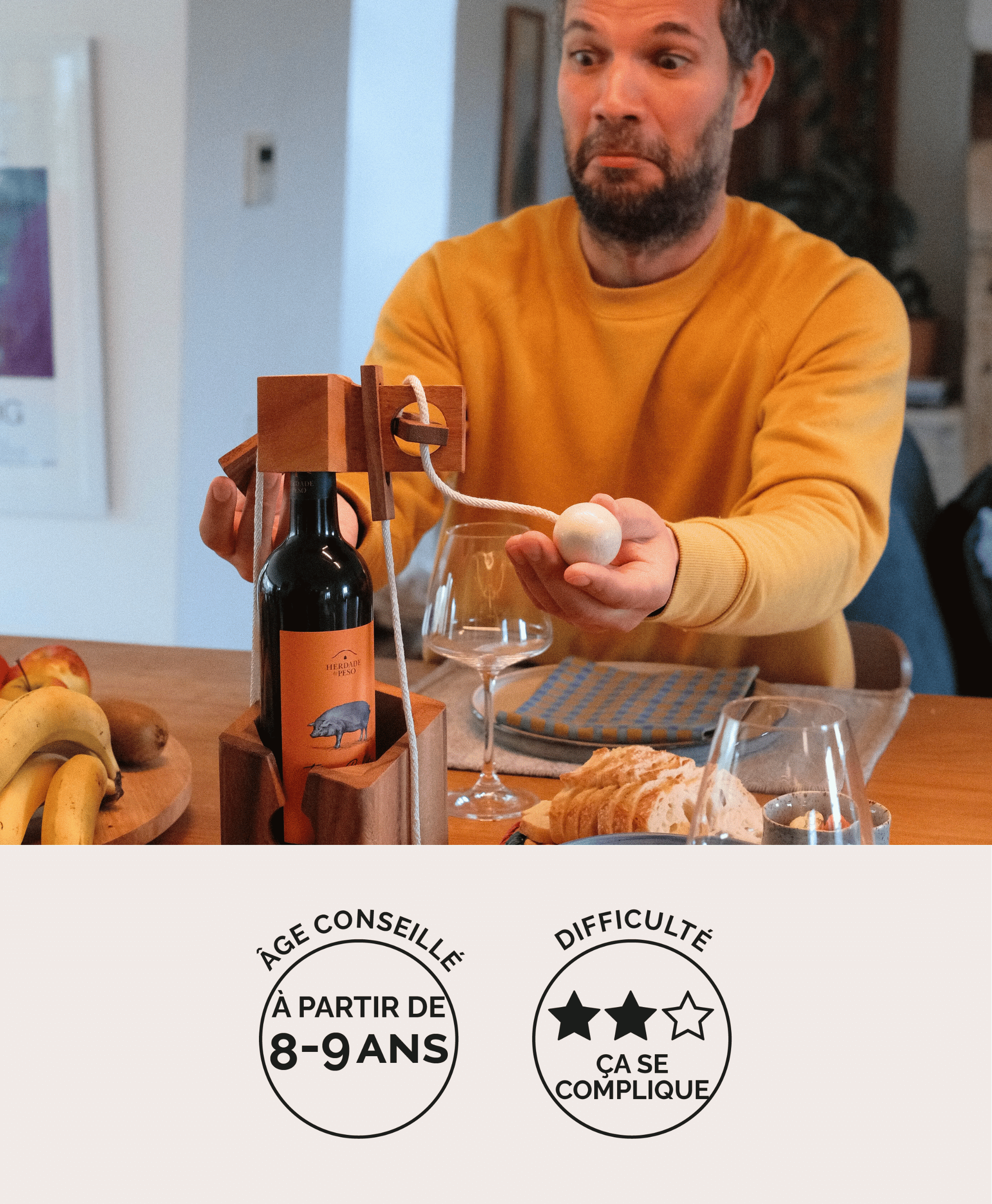 👉 Avant de savourer le contenu, il faudra relever le défi : libérer la bouteille en résolvant ce casse-tête astucieux qui demandera logique, patience et habileté.