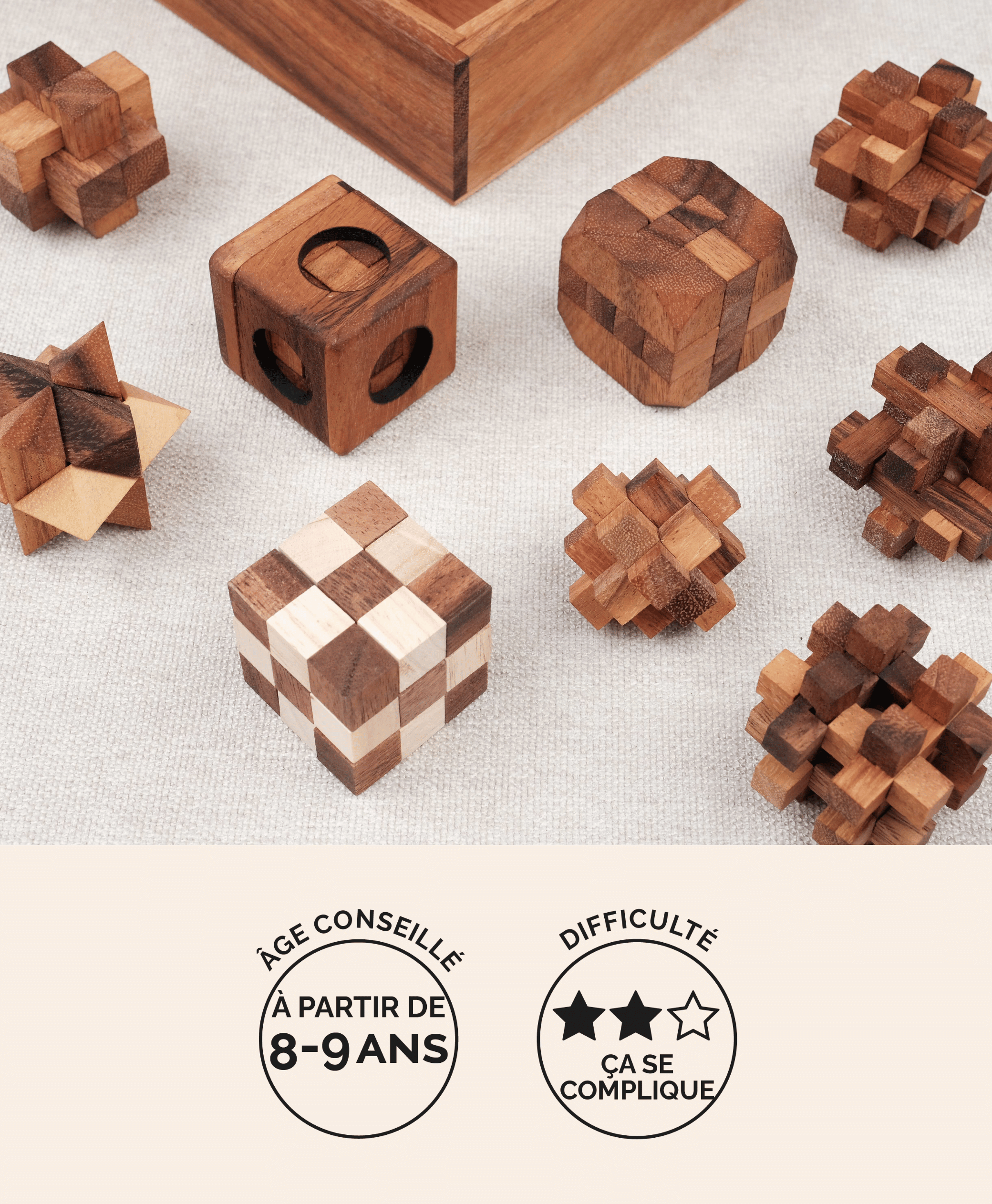 Ce superbe coffret en bois contient 9 casse-têtes en bois aux formes variées et aux niveaux de difficulté progressifs. Un véritable terrain de jeu pour l’esprit, parfait pour s’initier au plaisir des puzzles en bois !