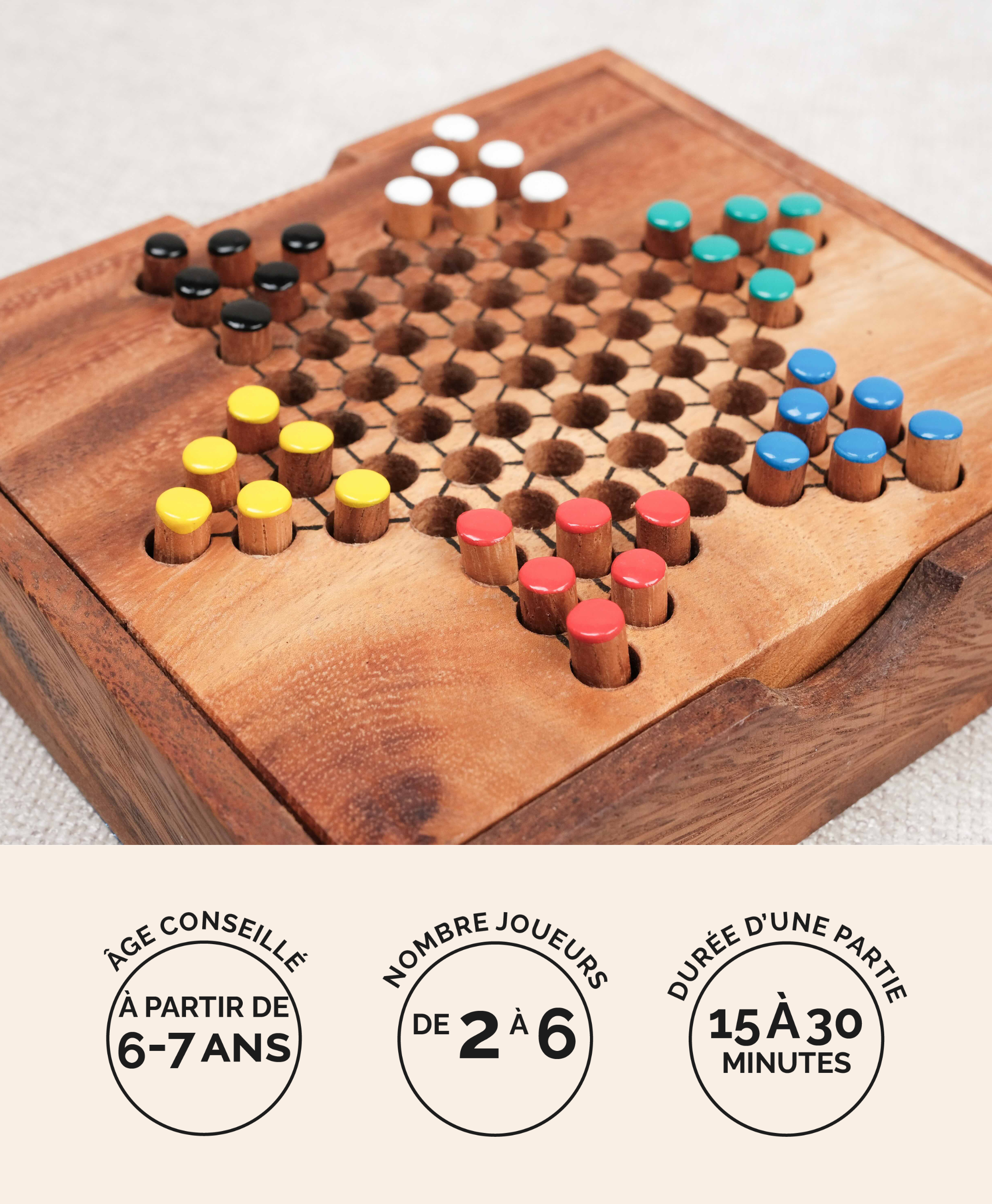 👉 Principe du jeu : de 2 à 6 joueurs s’affrontent pour déplacer tous leurs pions jusqu’à la pointe opposée de l’étoile. Tactique, logique et stratégie sont indispensables pour remporter la partie !