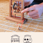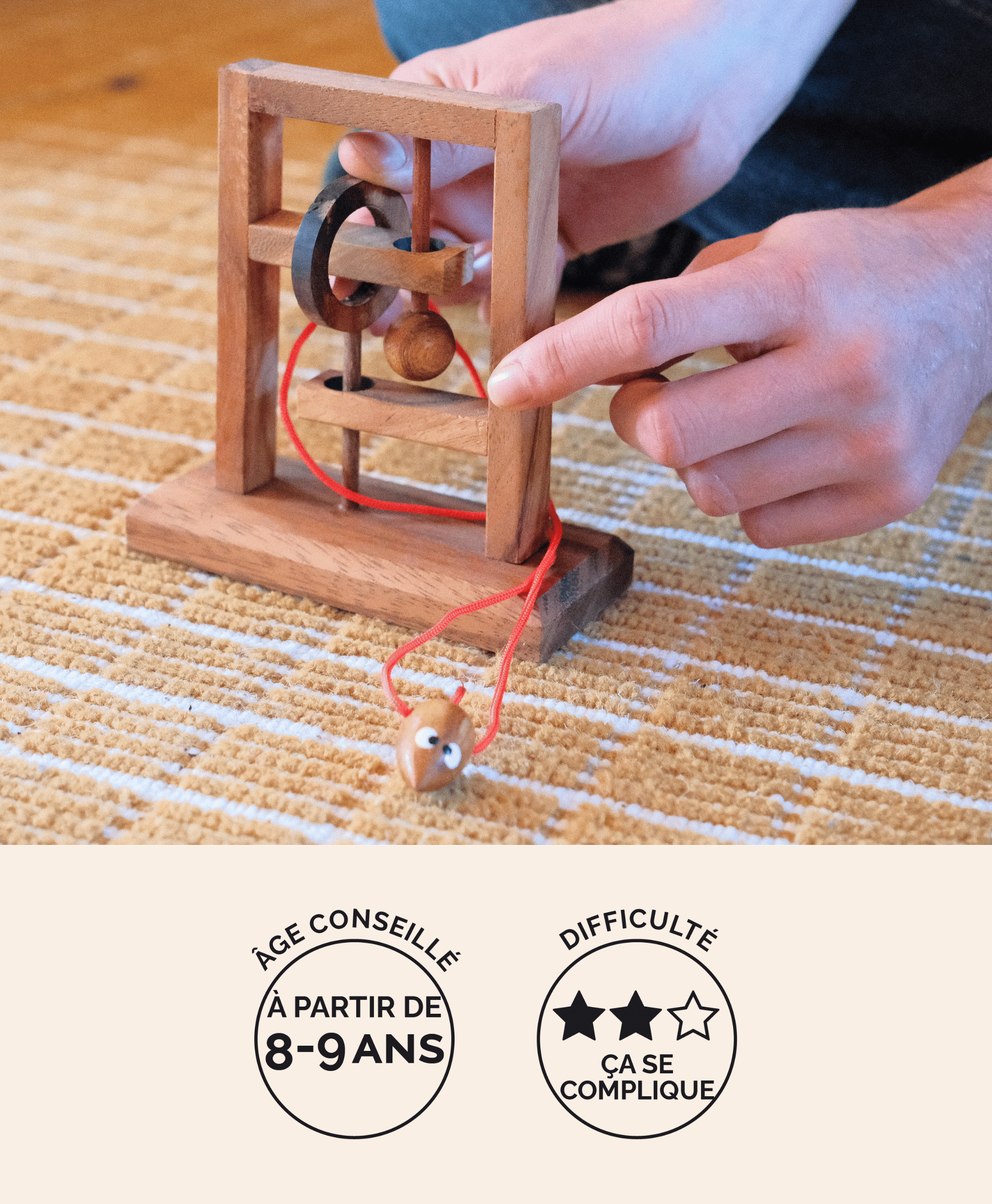Le défi ? Libérer la ficelle coincée dans cette structure ingénieuse, mêlant cordes, anneau et pièces en bois.