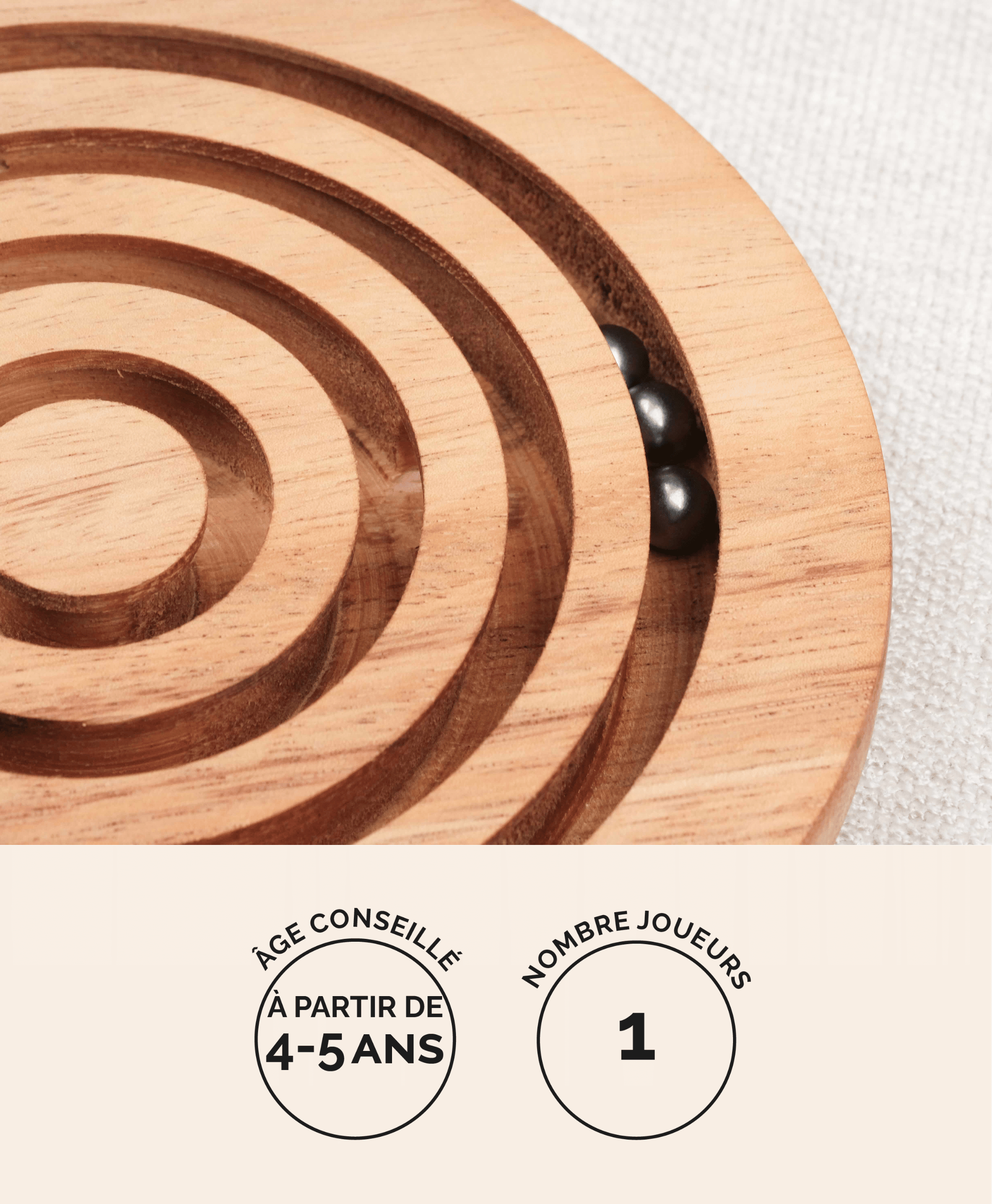 Un jeu d’adresse en bois où le joueur doit guider 3 billes métalliques à travers les rainures concentriques pour les amener jusqu’au centre.