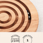 Vue d’ensemble du jeu d’adresse Labyrinthe en bois circulaire avec ses rainures concentriques – Jeux Faugère