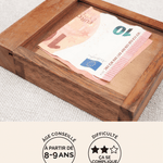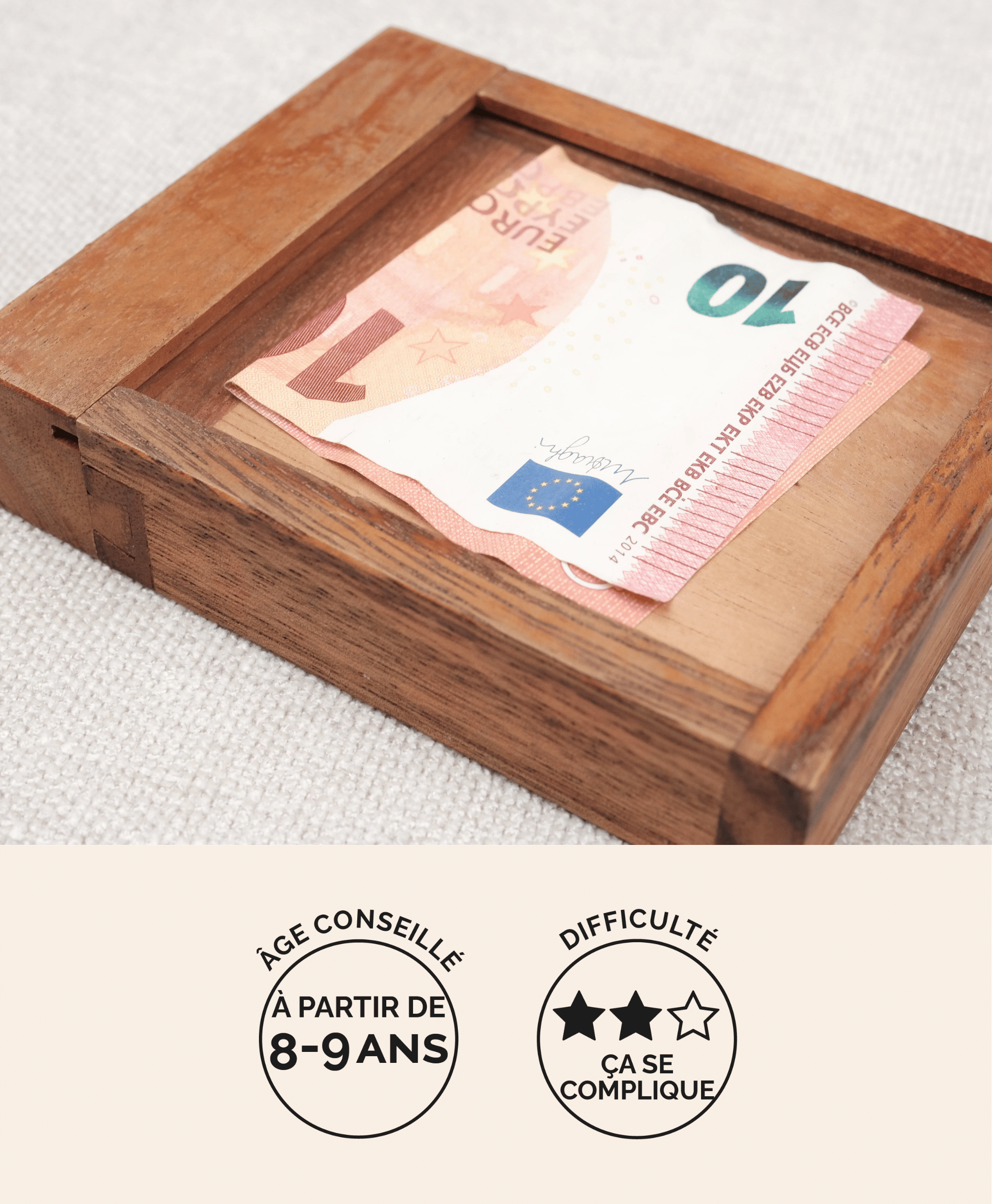 Avec Okazou, offrir de l’argent ou des tickets à gratter devient un vrai défi ! Cette boîte secrète en bois piège son contenu et oblige le joueur à résoudre le mécanisme caché avant de l’ouvrir.