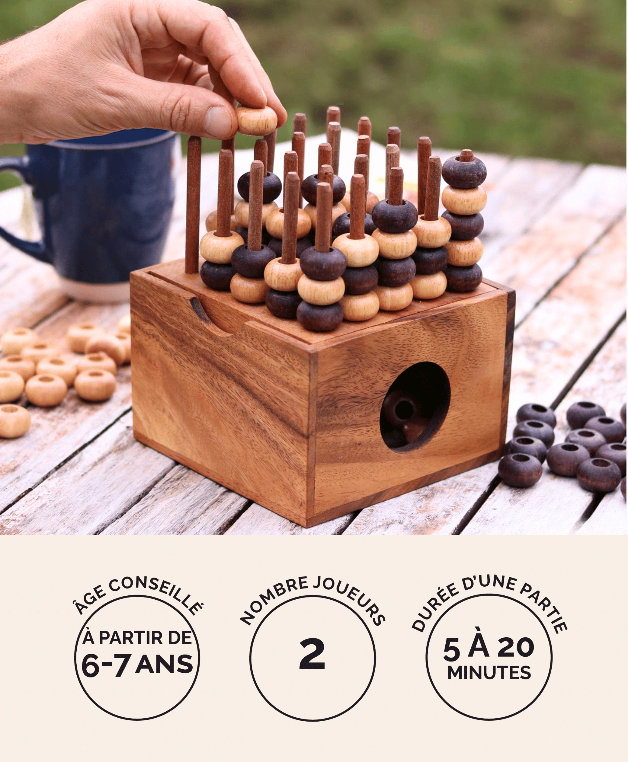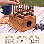Fabriqué en bois massif (acacia et hévéa), ce jeu associe élégance et robustesse. Son coffret pratique permet de ranger facilement tous les pions après la partie.