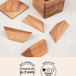 Casse-tête en bois Pyramides en Boîte – coffret ouvert avec les pièces rangées à l’intérieur